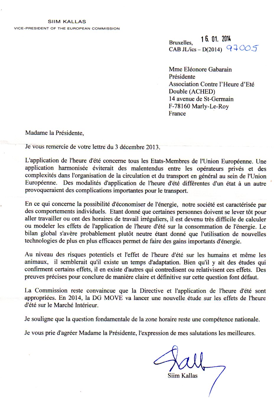 dont celle de l’heure d’été – M. Siim Kallas, a fait savoir à