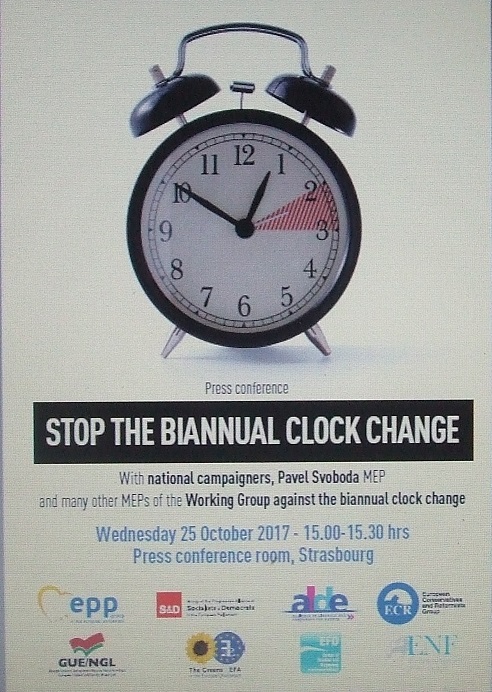 Les députés européens « chronophiles » (ceux qui aiment le temps, le vrai) vont intervenir une nouvelle fois lors de la session du Parlement à Strasbourg le 25 octobre après-midi avec une Conférence de presse.Voyez le poster d'annonce en haut à droite. L'ACHED y participera. C'est à l'initiative des mêmes personnes, députés européens et spécialistes, que l'audition de Bruxelles, il y a un an et demi, en début de séance plénière du Parlement. Ces TROP RARES députés se demandent pourquoi on ne tient toujours pas compte de l'avis d'une forte majorité des citoyens, qui n'a jamais aimé changer d'heure et qui en souffre! Si vous connaissez un député européen français, dites-lui de s'informer sur cet évènement et d'en tirer les enseignements! Les élus de toute l'Union européenne, dans leurs pays respectifs, sont conscients du problème, mais presque tous gardent le silence, car ils sont persuadés de leur impuissance vis-à-vis de la situation.